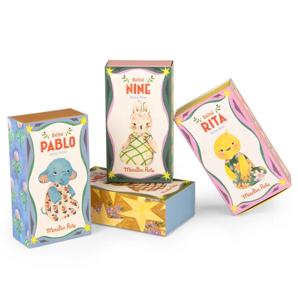 Moulin Roty baby Nine het Konijn uit de Les Minouchkas serie is verpakt in een prachtige cadeaudoosje. Nine houdt van boeken en tenten bouwen.