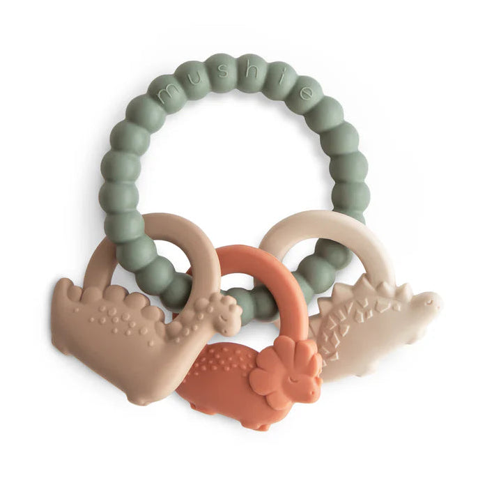Mushie bijtring dino is een silicone bijtspeeltje voor je kleintje met 3 verschillende dino-elementen. Dit siliconen bijtspeelgoed is geschikt om te gebruiken vanaf 3 maanden en ook bij het doorkomen van de eerste tandjes, rond 6 maanden.