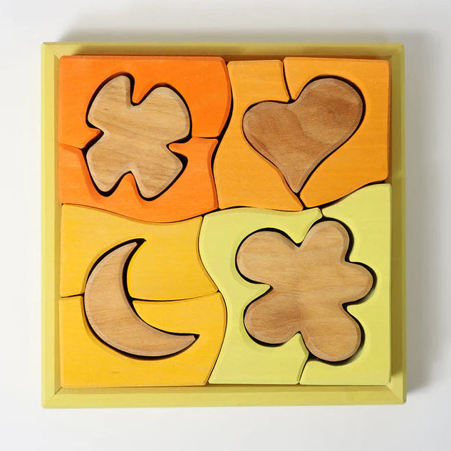 De vrolijke, zomers gekleurde blokken bieden een eerste kennismaking met de primaire en secundaire kleuren en hun verschillende effecten. Deze set bestaat uit houten blokken in de kleuren geel en drie tinten oranje. Inclusief vier vormen in een neutrale, houten kleur: hartje, klavertje vier, maantje en een organische bloemenvorm.