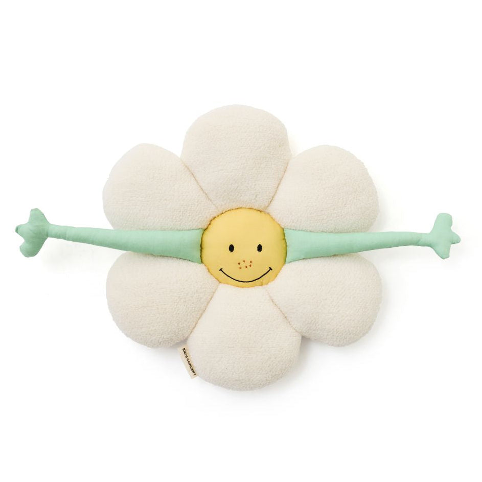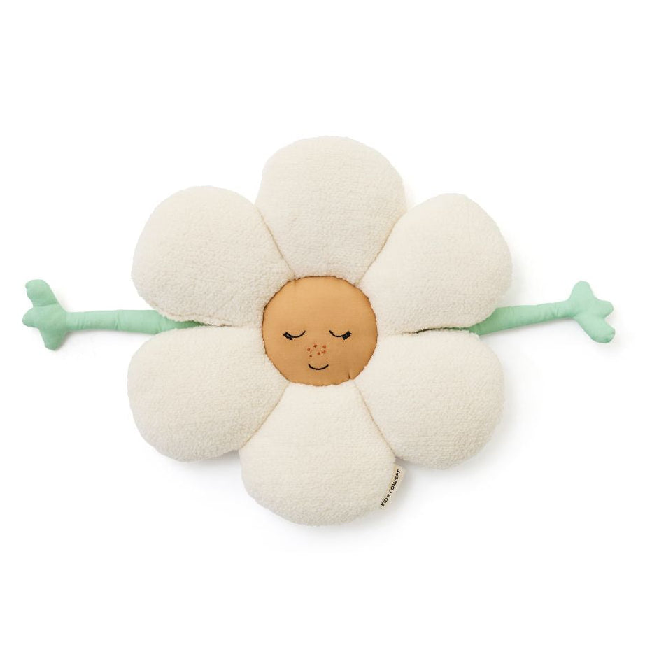 Kids Concept kussen in de vorm van een madeliefje. Dit zijdezachte kussen is een ideale accessoire voor in de kinderkamer of speelhoek. Het vrolijke ontwerp maakt het een fijn speelmaatje voor ieder kind. De wit met (mosterd)gele bloem heeft lichtgroene armen en twee gezichtjes: een lachend gezichtje aan de ene kant en een slapend gezichtje aan de andere kant. De bloemblaadjes zijn gemaakt van het zachte sherpa teddy fleece en biedt urenlang knuffelplezier. Het gezichtje is gemaakt van velour.