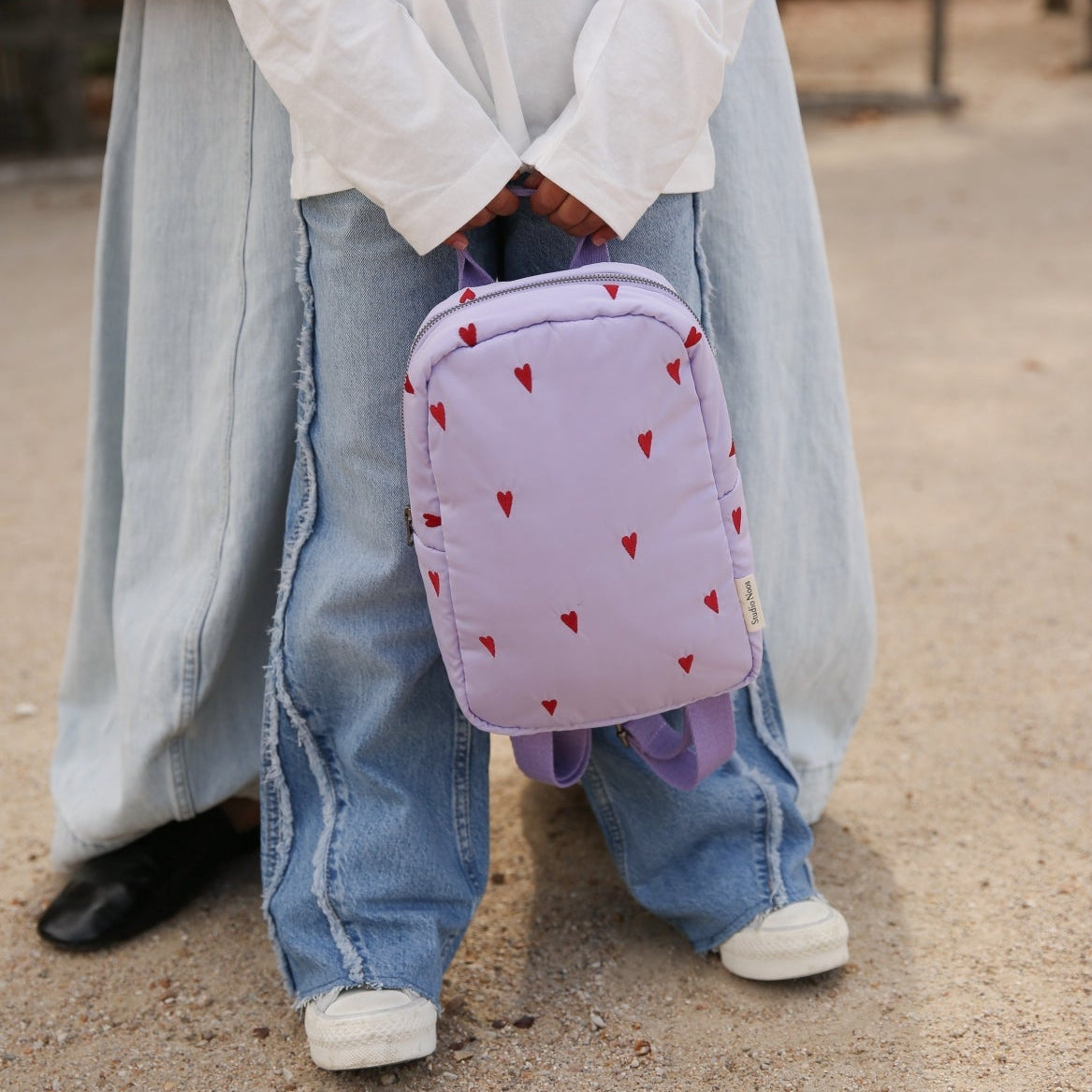 Studio Noos puffy mini backpack purple hearts, in deze lila kinderrugzak met rode geborduurde hartjes neem je al je spullen makkelijk mee naar school. De trendy lichtgewicht rugzak maakt de outfit van je kindje helemaal af!