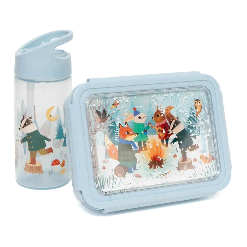 Petit Monkey broodtrommel, de bento lunchbox heeft 3 losse vakken die je naar wens in de grote trommel plaatst. De deksel met dieren rond een kampvuur sluit met een makkelijk click systeem, in de deksels zitten prachtige sterretjes.