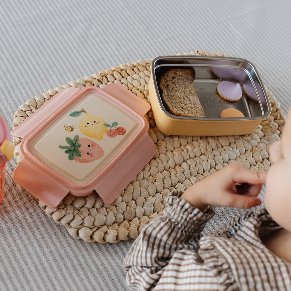 Heel leuk te combineren met de bijpassende Sparkling Fruits 2 in 1 drinkfles van Petit Monkey. De broodtrommel mag in de vaatwasser. De binnen kant is van RVS gemaakt.