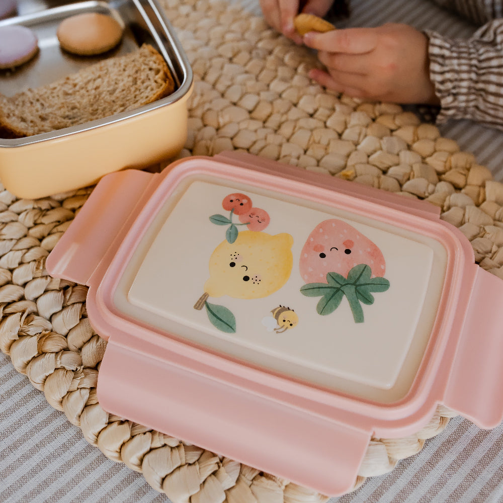 Petit Monkey bento lekvrije broodtrommel met schattige fruitsoorten bovenop. De leukste broodtrommel om mee te nemen naar school of op avontuur. Je kind maakt helemaal de blits met deze mooie lunchbox!