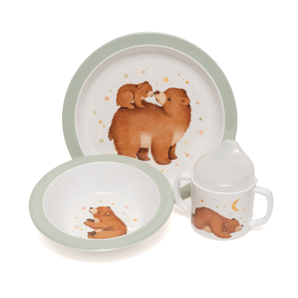 Petit Monkey melamine bakje Bear and Stars is uit te breiden met een bord of tuitbeker met oren uit dezelfde serie, of mix and match met de andere kleuren en printjes uit de webshop. Maak je kinderservies set helemaal compleet