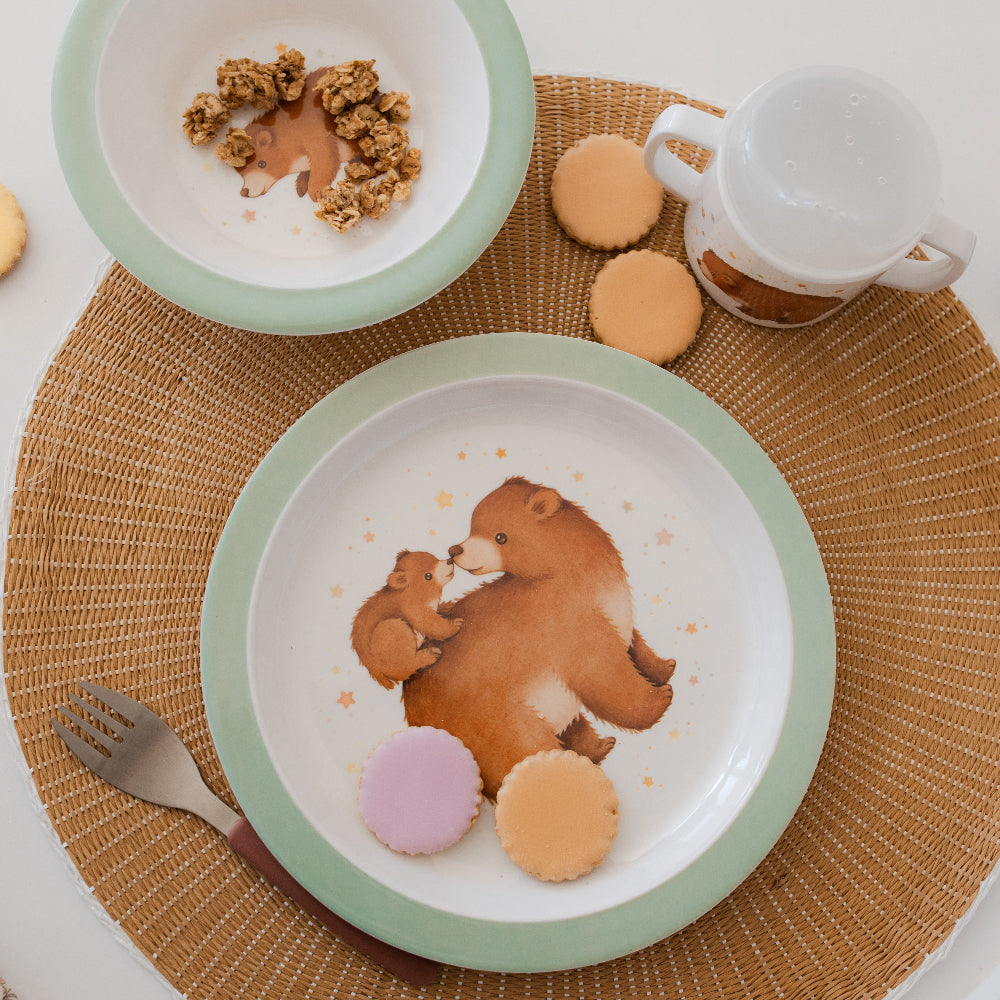 Petit Monkey kinderbord met groene rand en een mama- en babybeer en sterren. Het bord... Lees meer