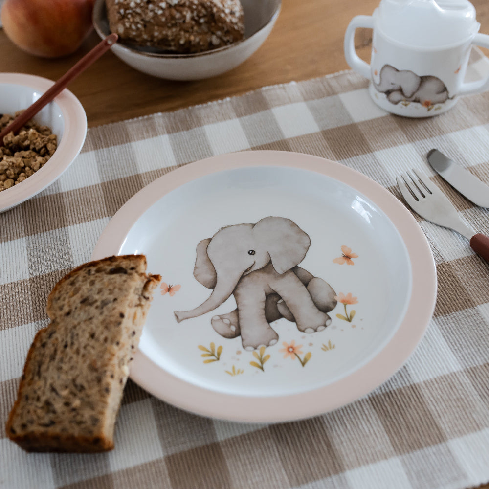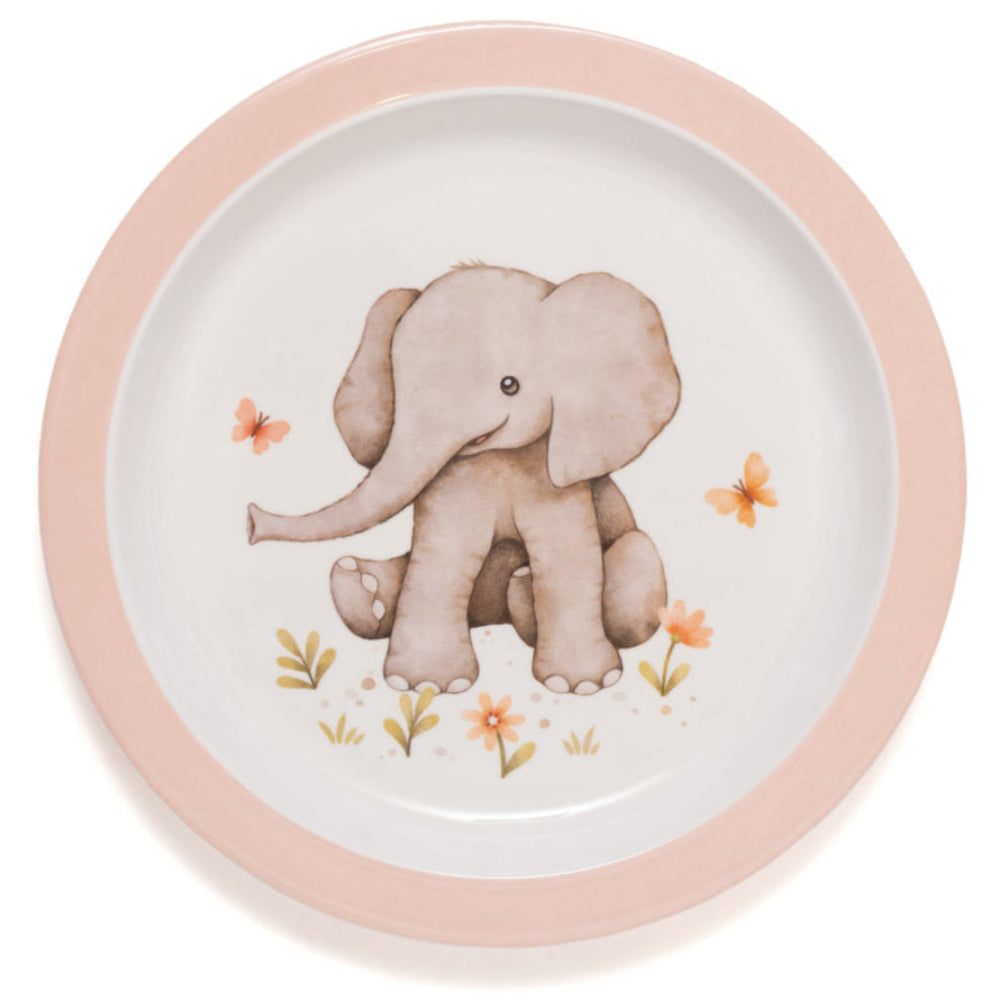 Petit Monkey kinderbord met perzik rand en een olifant. Het bord is gemaakt van 100%... Lees meer