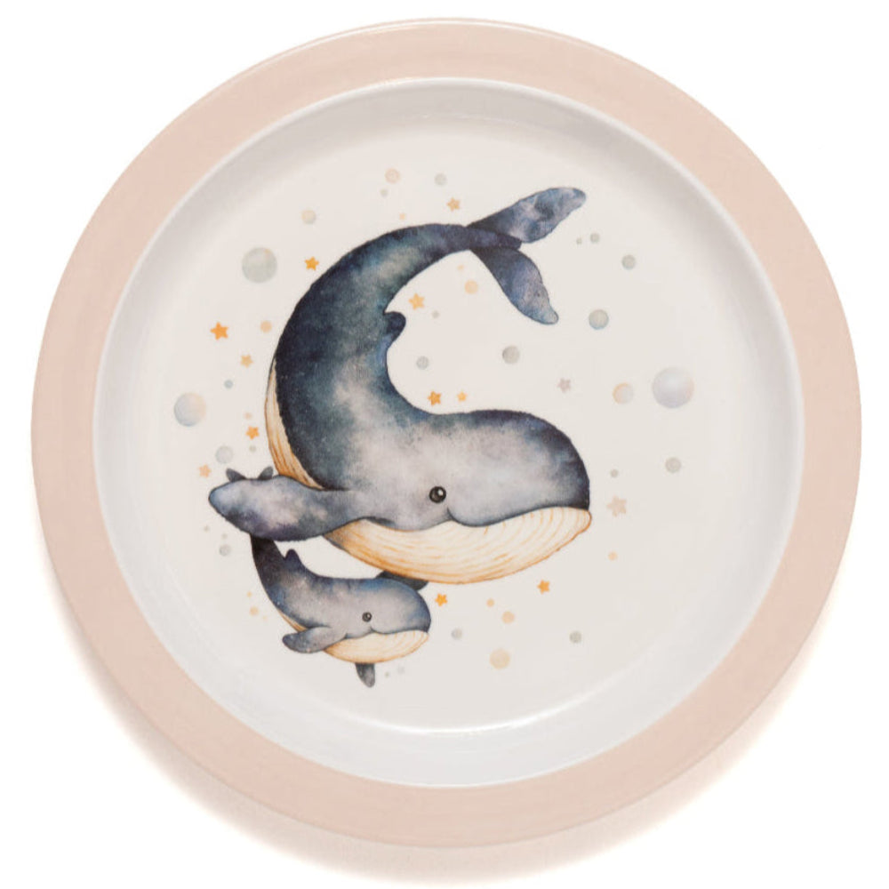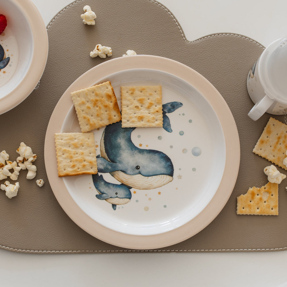 Petit Monkey kinderbord met beige rand en een mama- en babywalvis. Het bord is gemaakt... Lees meer