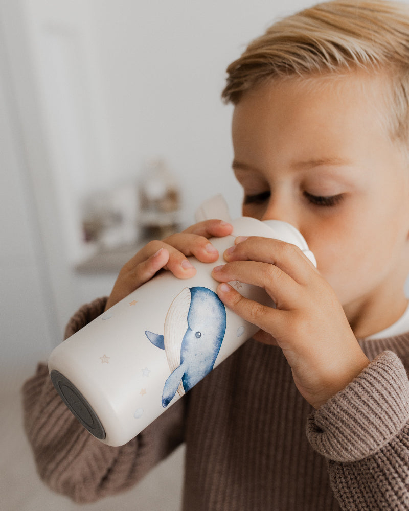 Petit Monkey stainless steel drinkfles Whale heeft een beige kleur, is geïllustreerd door Nina Stajner en heeft een inhoud van 350 ml. We raden aan om de fles altijd met de hand te wassen om de levensduur van de fles en de bedrukking te optimaliseren.