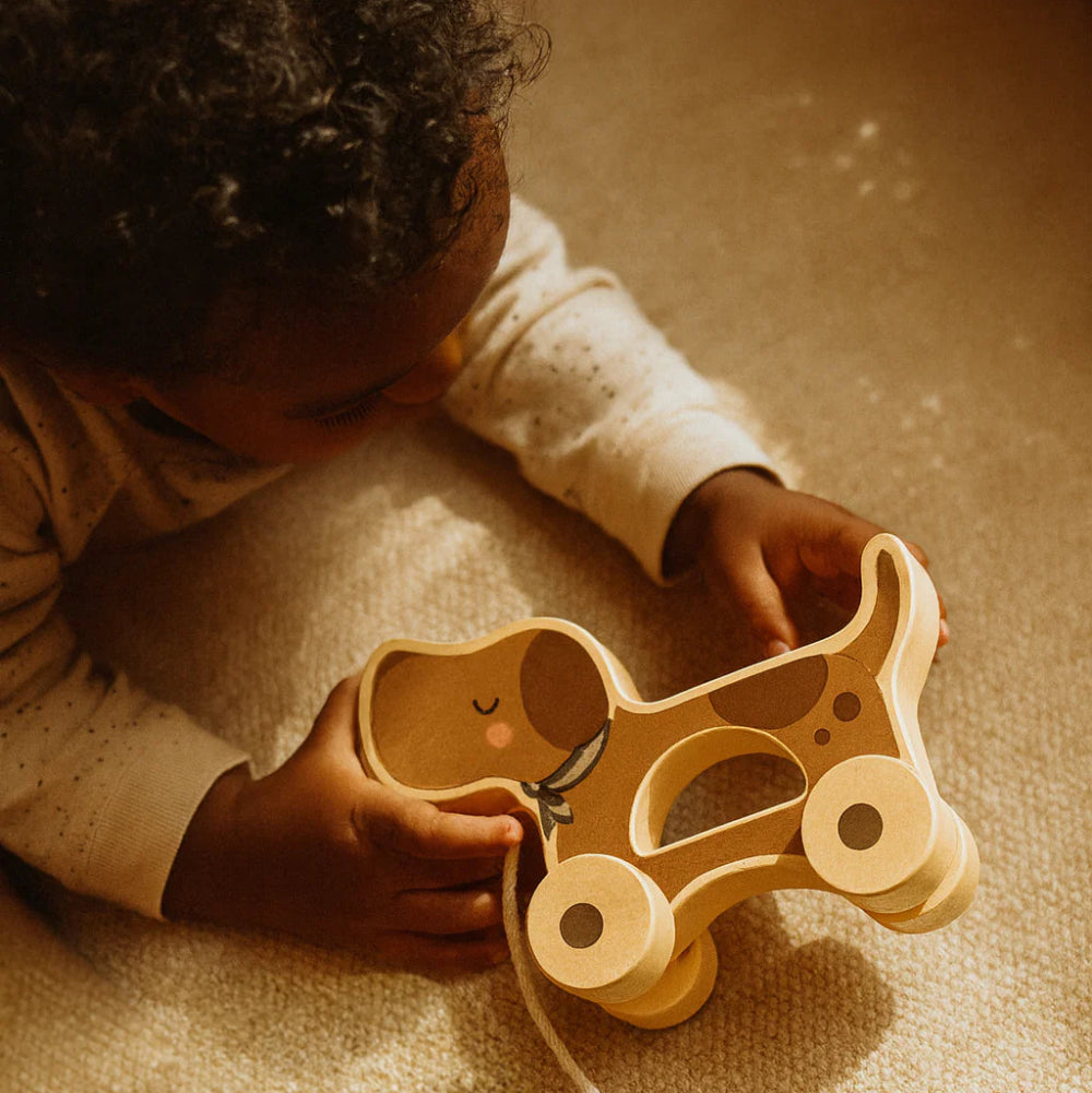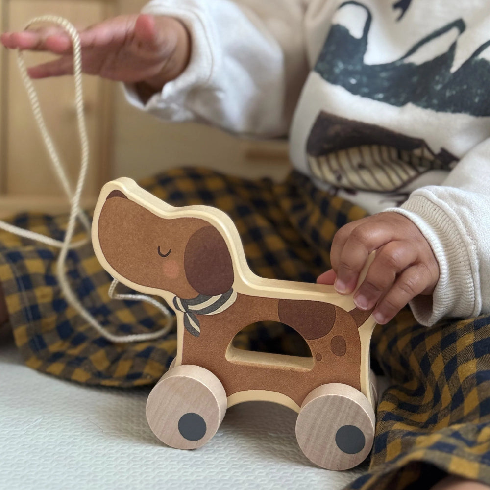 Houten trekfiguur hondje Poppy van Mrs Ertha, een schattige puppy die overal mee naartoe rolt. De mooie pastelkleuren zorgen voor rust in huis én in je hoofd.