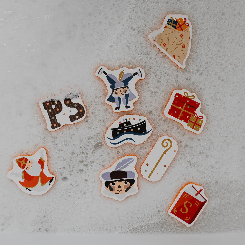 Al eens in bad gezeten met Ozosnel? Sint en de Pieten nemen graag een duik met jou. De staf en het grote speelgoedboek en natuurlijk ook wat chocoladeletters, ze zitten allemaal in dit vrolijke bedspeelgoed. Groot feest tijdens het badderen. De puzzelstukken blijven drijven en na gebruik laat je ze drogen in het zakje. Wanneer de puzzelstukken en de wand nat zijn blijven ze plakken!