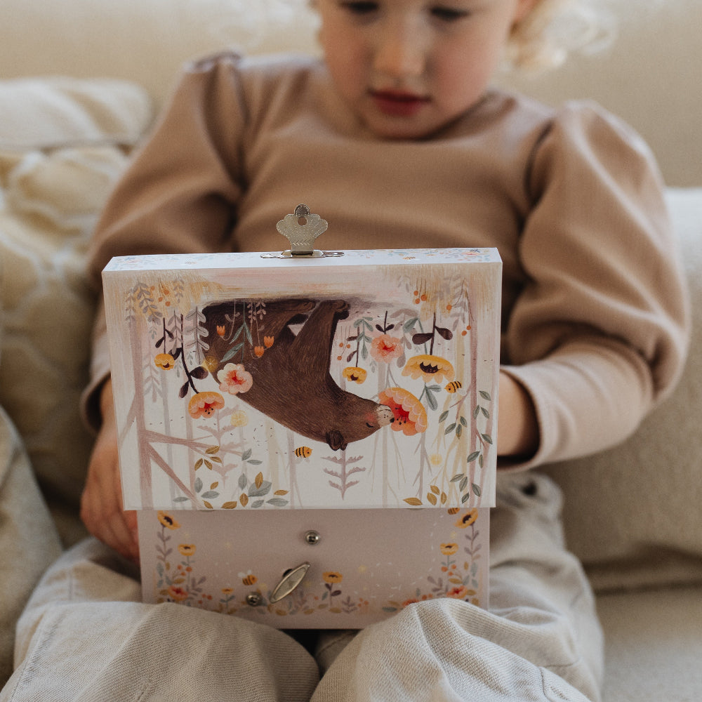 Aan de buitenkant van de bijoux doos zie je een beer, prachtige bloemen en bijtjes op een linnen achtergrond. Geïllustreerd door Kendra Binney. Open de deksel en het beertje komt tevoorschijn op een gele bloem. De muziekdoos heeft een laatje, hierin bewaar je nog meer moois.