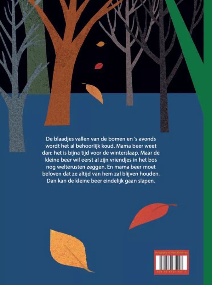In dit prentenboek in herfst thema volgen kinderen kleine Beer tijdens zijn tocht door het bos, waar hij al zijn vriendjes nog één keer welterusten wil zeggen. Geschikt voor kleuters vanaf 3 jaar die houden van dierenverhalen. De zachte illustraties helpen kinderen ontspannen en maken het boek een ideaal voorleesboek voor het slapengaan.