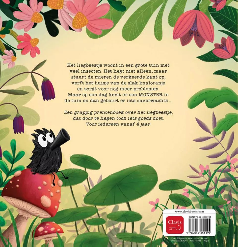 Het liegbeestje is een grappig en kleurrijk prentenboek. Het verhaal speelt zich af in een grote tuin vol insecten, waar het liegbeestje de boel flink op stelten zet. Hij stuurt de mieren de verkeerde kant op, maakt de vlinder wakker voordat ze daar klaar voor is en ontkent alles wat over hem gezegd wordt. Maar wanneer er ineens een monster in de tuin verschijnt, blijkt dat zelfs liegen onverwacht iets goeds kan opleveren.