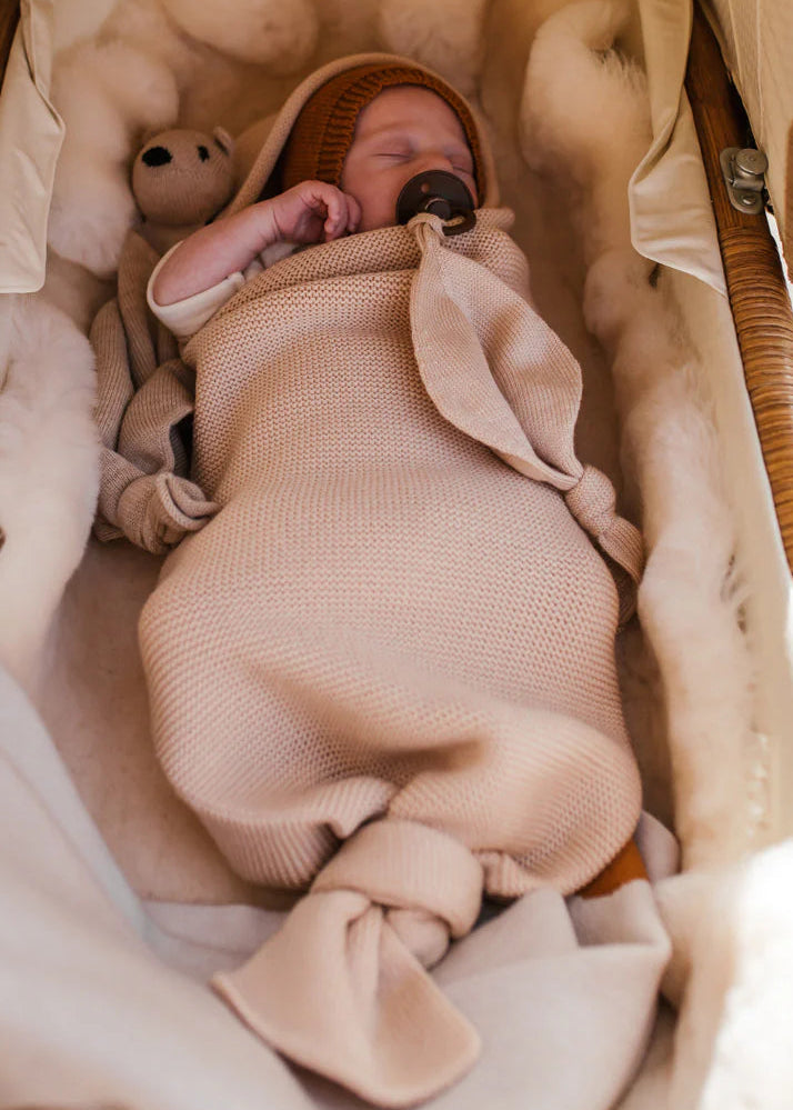 De wollen cocoon is geschikt voor pasgeboren baby's van 0-8 maanden en gebreid in een ribbel knit deze zorgt voor extra elasticiteit en rekbaarheid zonder vormverlies van de cocoon.