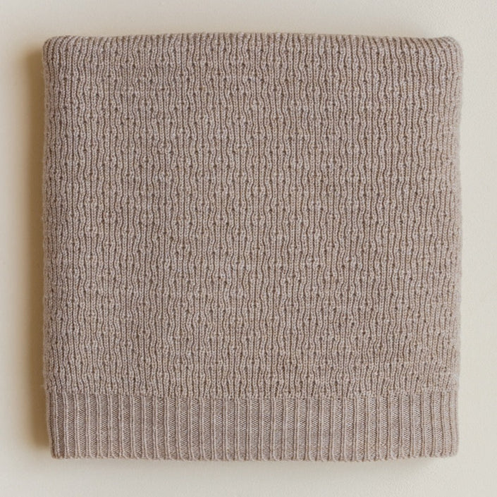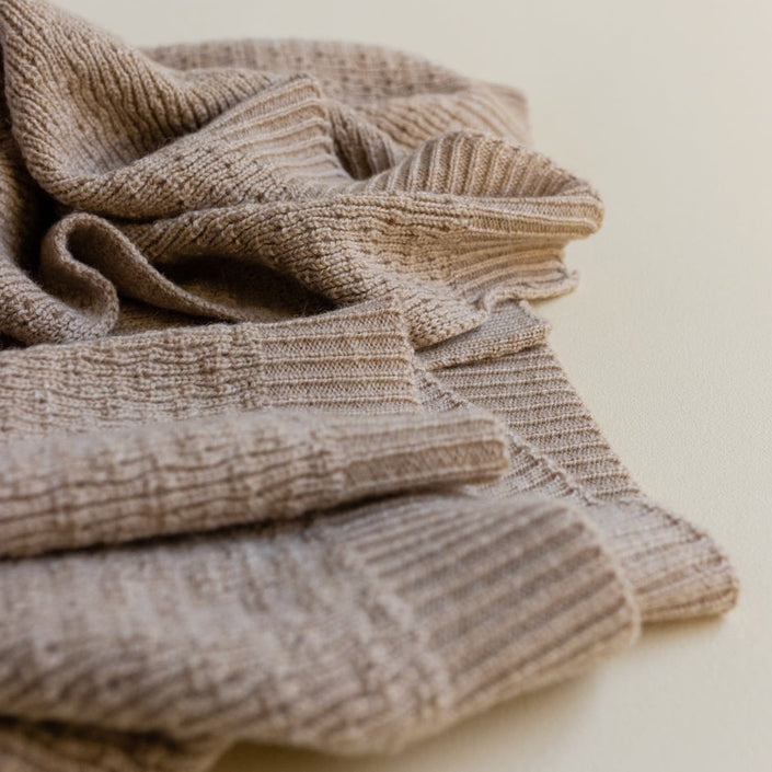 HVID deken gebreid in warme rib knit daardoor zeer geschikt voor koudere dagen. Deken dora sand is zacht en hee; fijn als baby deken of omslagdoek, gemaakt van 100% merino wol, gebreid in een rib knit met een werkje. Het dekentje heeft een rib rand 5 cm hoog aan de lange zijde.