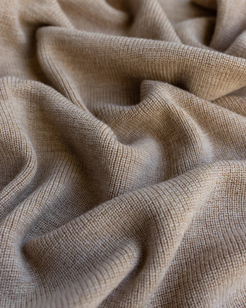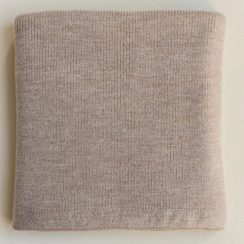 HVID deken Felix is gebreid in een soepele patent steek knit, de zand deken is zacht en warm en gemaakt van 100% merino wol. De deken heeft een prachtige ribbel rand met een glad boordje.