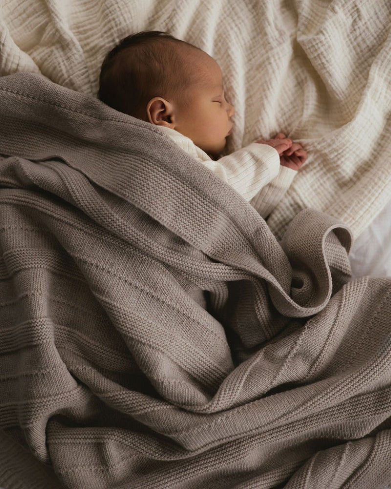 HVID deken Holly is gebreid in een fantasie rib knit, de dikke zand kleurige deken is zacht en warm en gemaakt van 100% merino wol en houd je baby warm tijdens de koude winterdagen.