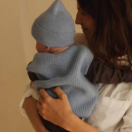 Spencer Harvey houdt kleintje lekker warm, het wollen licht blauwe vest is naadloos in één stuk gebreid, wat het erg comfortabel maakt voor kindjes.