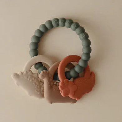 Mushie bijtring dino is een silicone bijtspeeltje voor je kleintje met 3 verschillende dino-elementen. Dit siliconen bijtspeelgoed is geschikt om te gebruiken vanaf 3 maanden en ook bij het doorkomen van de eerste tandjes, rond 6 maanden.