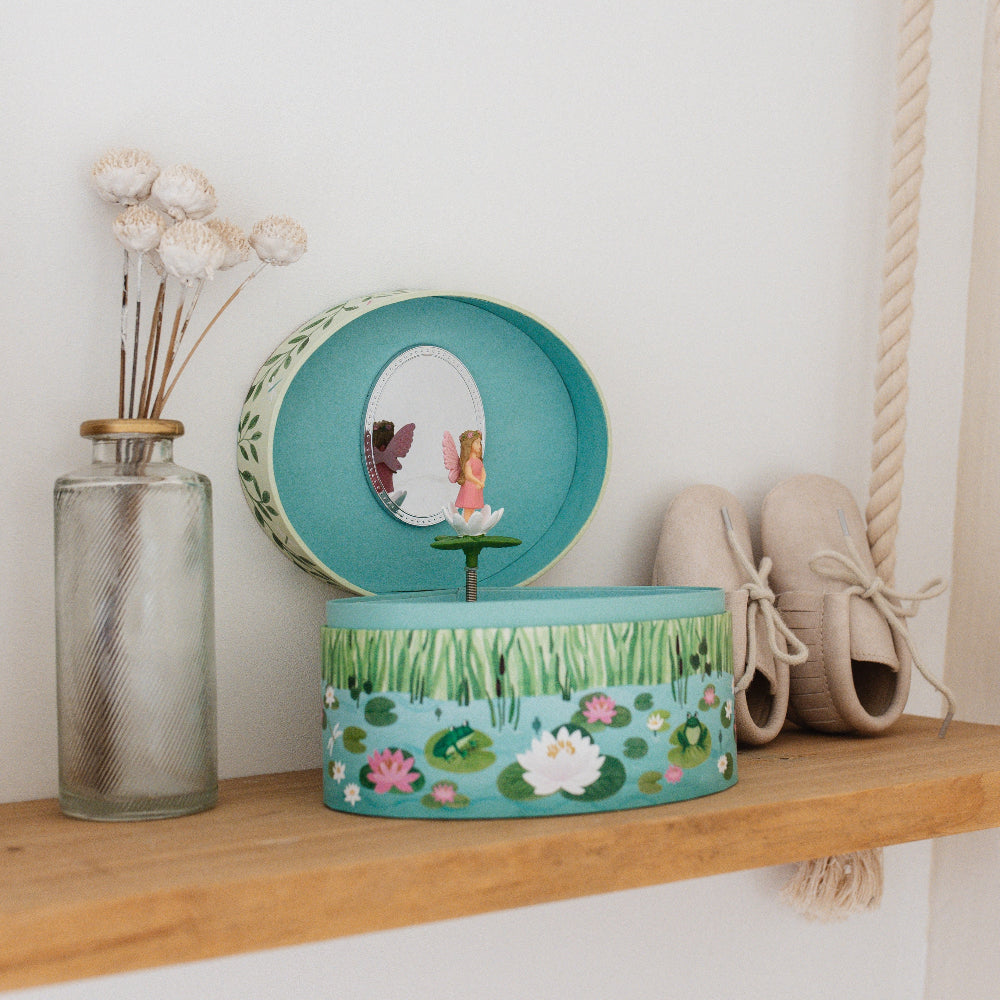 Aan de buitenkant van de ovale bijoux doos zie je de fee op haar schommel in een meer vol lelie's en kikkers, geillustreerd door Rebecca Jones. Open de deksel en de fee komt tevoorschijn op een lelieblad.